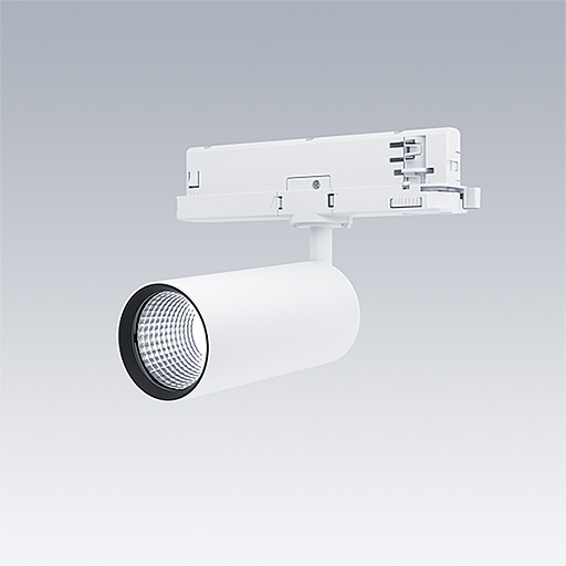 Projecteur LED pour installation sur rail triphasé avec distribution lumineuse de type projection et température de couleur stabilisée. Electronique, non gradable. Classe électrique II, IP20. Corps : aluminium Moulage sous pression, peinture microtexturée blanc. Réflecteur : PC poudré. Projecteur orientable sur le plan horizontal de 360° et inclinable sur le plan vertical de 90°. Livré avec LED 3 000 K