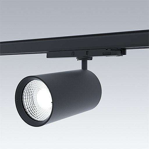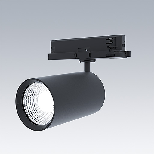 Projecteur LED pour installation sur rail triphasé avec distribution lumineuse de type spot et température de couleur stabilisée. Electronique, non gradable. Classe électrique II, IP20. Corps : aluminium Moulage sous pression, peinture microtexturée noir. Réflecteur : PC poudré. Projecteur orientable sur le plan horizontal de 360° et inclinable sur le plan vertical de 90°. Livré avec LED 3 000 K