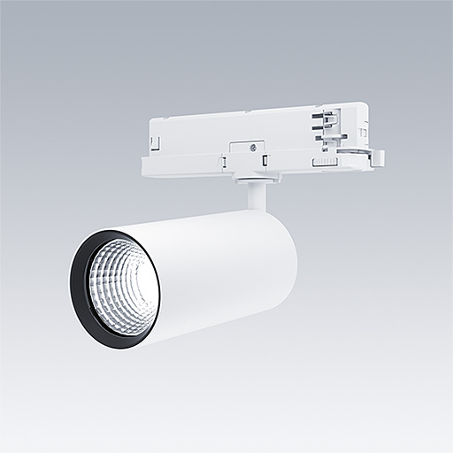 Projecteur LED pour installation sur rail triphasé avec distribution lumineuse de type projection large et température de couleur stabilisée. Electronique, non gradable. Classe électrique II, IP20. Corps : aluminium Moulage sous pression, peinture microtexturée blanc. Réflecteur : PC poudré. Projecteur orientable sur le plan horizontal de 360° et inclinable sur le plan vertical de 90°. Livré avec LED 4 000 K