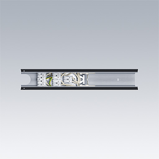 Element zasilania elektrycznego, biały, wykonany z blachy stalowej walcowanej, do elektrycznego połączenia w linie ciągłe. Wtykowe listwy zaciskowe do 5 kabli zasilania z sieci elektroenergetycznej, 2 x 2 kabli oświetlenia awaryjnego i 2 linii sterujących. W komplecie zaślepki końcowe i pokrywy ochronne, żeby zapobiec przypadkowemu kontaktowi z przewodnikami elektrycznymi.