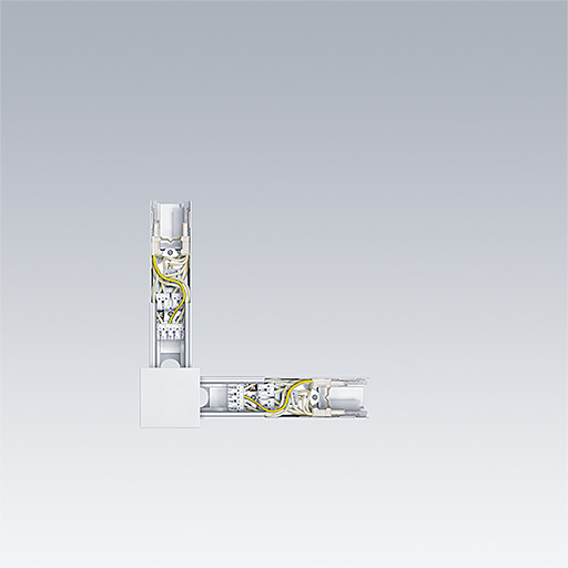Mechaniczne i elektryczne złącze o kształcie L w kolorze bialy. Ma dwa zakończenia męskie do złącza mechanicznego i 2 grupy listew zaciskowych do wejścia lub wyjścia elektrycznego.