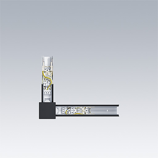 Mechaniczne i elektryczne złącze o kształcie L w kolorze czarny. Ma jedno zakończenie męskie i jedno żeńskie do złącza mechanicznego i 2 grupy listew zaciskowych do wejścia lub wyjścia elektrycznego.