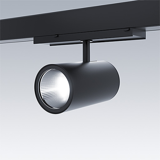LED spotlight for CONTUS continuous-row systems with spot light distribution and stabilized color temperature. Electronic, switchable luminaire control gear. Class II electrical, IP20. Luminaire with CONTUS adapter for simple, rapid mounting of luminaire to CONTUS continuous-row systems. Body: die-cast aluminium black micro-textured paint. Reflector: PC sputtered. Spotlight rotatable through 337° and pivotable through 90°. Complete with 3000K LED, maximum efficiency