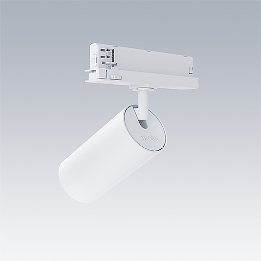 LED spotlight for 3 phase track installations with wide flood light distribution and stabilized color temperature. Electronic, fixed output control gear. Class II electrical, IP20. Body: Die-cast aluminium white micro-textured paint. Reflector: PC sputtered. Spotlight rotatable through 360° and pivotable through 90°. Complete with 4000K LED