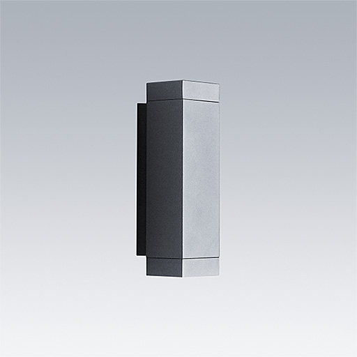 Axyl Glow, a wall mounted, architectural LED luminaire for decorative facade lighting, 2 window with wide beam up and down distribution. Class III electrical. DALI-2 dimmable Remote LED driver. IP65, Impact strength: IK06. Housing: Die-cast aluminium, powder coated textured grey (RAL9006). Working ambient temperature: -20°C to +50°C. Complete with 4000K LED.