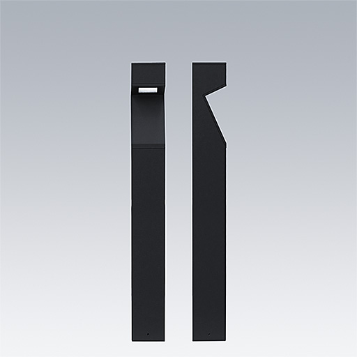 Axyl Geo, a free-standing, decorative LED bollard with asymmetrical distribution. Class I electrical.. DALI-2 dimmable LED driver. , IP65, Impact strength: IK06. Housing: Die-cast aluminium, powder coated textured black (close to RAL9005). Working ambient temperature: -20°C to +45°C. Complete with 2700K LED..